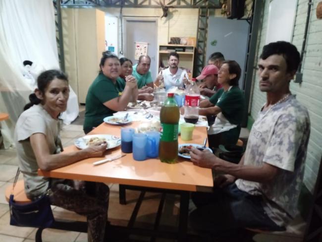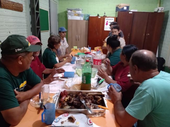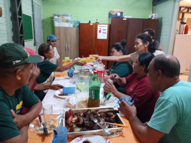 No dia 24 de dezembro, a Cooperativa de Trabalho Amigos do Meio Ambiente (COAMA), realizou almoço de confraternização entre os cooperados, selando o encerramento do ano de 2021. Após o almoço, a presidenta Eva entregou mimo a cada um dos cooperados em sinal de gratidão. O almoço foi organizado pela monitora do Projeto TransformAção, Ir. Dilse Santin, que assessora o grupo semanalmente. A atividade foi realizada no espaço de atendimento das Crianças e Adolescentes, sala ao lado da cooperativa, porém mesmo pavilhão que abriga a Coama e o Programa 3 – Crianças e Adolescentes do Projeto TransformAção. Além dos cooperados da Ir. Dilse, Iltomar Siviero, coordenador do Programa Cooperativismo, marcou presença no momento de confraternização. Foi um momento importante para concluir os trabalhos ano reforçando o espírito coletivo e de união entre todos os cooperados e Projeto TransformAção.