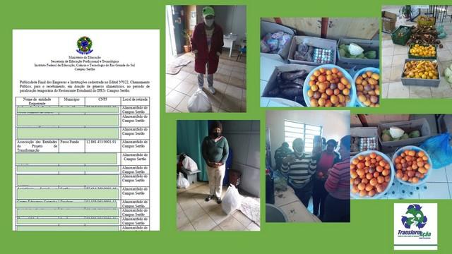 A Associação das Entidades do Projeto TransformAção foi contemplada pelo Instituto Federal Riograndense - Campus Sertão, com a doação de alimentos como legumes, frutas, ovos, carnes, extrato de tomate, entre outros. Por meio de um edital de chamamento público, as entidades de assistência social poderiam se inscrever para receber as doações. O TransformAção foi uma das 12 entidades selecionadas. Os alimentos foram destinados ao público assistido pelo Projeto TransformAção. Tanto catadores das cooperativas assessoradas pela entidade, como as crianças e adolescentes e famílias do serviço de convivência e fortalecimento de vínculos foram contempladas. O Projeto TransformAção agradece ao IFRS-Campus Sertão pela doação e reconhecimento do trabalho desenvolvido. Seguimos na missão de cuidar da vida, cuidar da natureza, cuidar das pessoas.